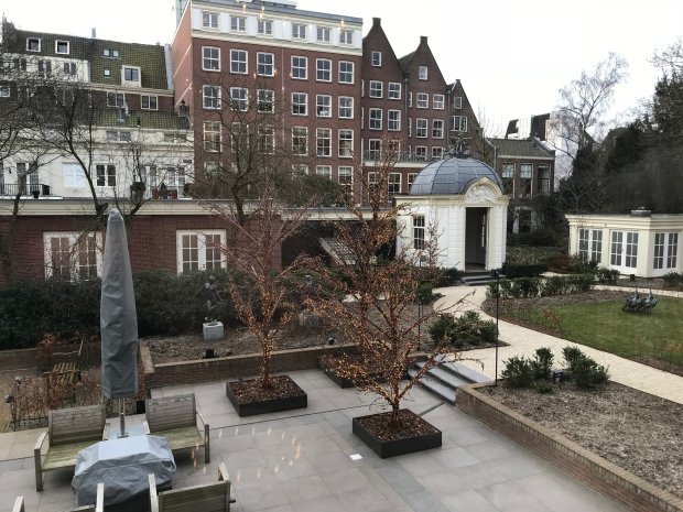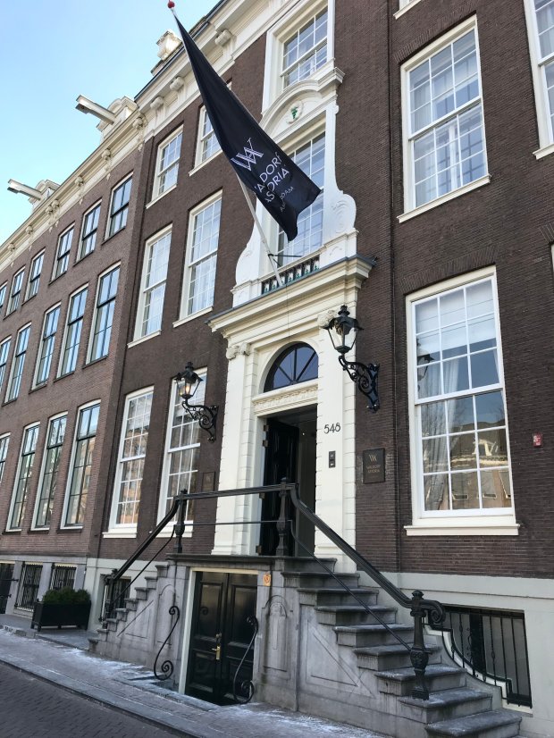 We arrived in an Uber, and a bellman swooped down the stairs and took our bags into a separate entrance while we went to check in. Our first instinct that this hotel was going to be fancy AF was when we sat down at the check-in desk and another bellman brought us hot towels. (Any time you sit down at a check-in desk rather than standing at a counter, you know it’s going to be pretty fancy, but the hot towels were over-the-top.) It was a nice treat, since it was approximately minus six million degrees in Amsterdam and we had just gotten off a long flight.