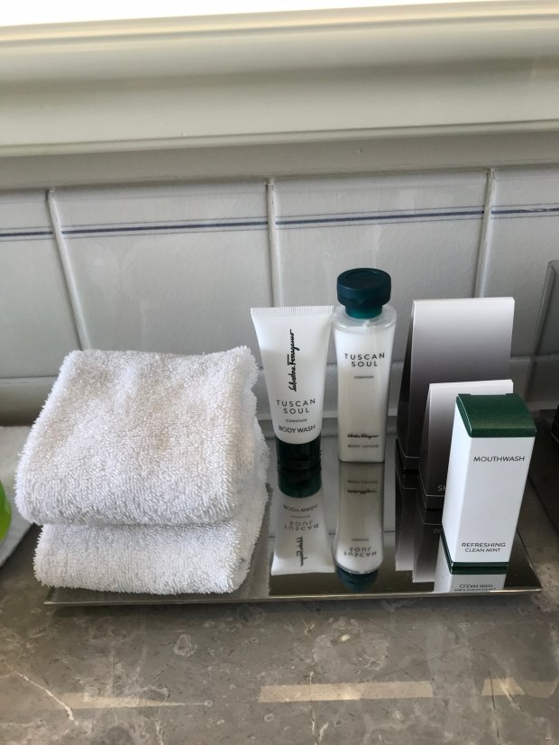 The bathroom was what you’d expect from a hotel of this caliber, with heated floors, a walk-in shower with excellent pressure, a deep soaking tub with a TV, and soap/lotion/shampoo everywhere you looked. Little touches like the name of the hotel and logo in the shower drain drove the point home that this was no ordinary hotel.
