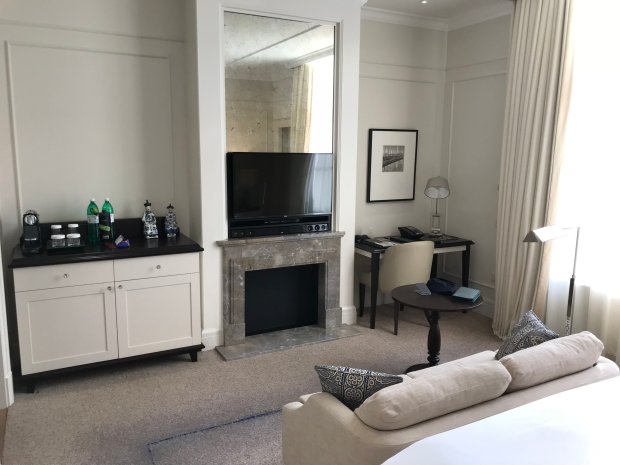 Marta, the check-in agent, was friendly as could be, and she happily told us that not only was our room ready early, but that we had been upgraded a few categories on account of my Diamond status. Honestly, the upgrade was just gravy as soon as she told us the room was ready — we arrived around 10:45 AM and weren’t looking forward to having to kill four hours while we waited for check-in. The check-in experience continued with the hotel’s signature presentation of four scents that you can choose to have sprayed in your room at turndown service, and finally Marta escorted us to our room and pointed out some of the period details of the original buildings that had been preserved.