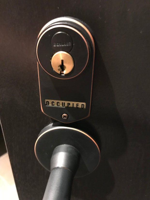 I do wish that United had provided a better means of determining whether a stall is occupied, since it’s really hard to read the word “occupied” on the door. It’s under the lock, and the dark lighting makes it almost invisible. I know I’d feel like a real weirdo putting my face right up the handle on every bathroom trying to find one to use.