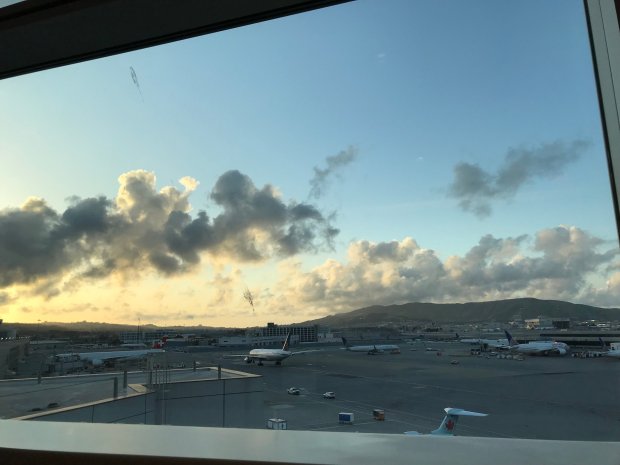 The lounge is long and narrow, with two levels that snake along the edge of SFO’s international terminal. The shape means that there’s a mostly unbroken panorama of the airport, including a great view of the widebody aircraft lined up at the international terminal’s G gates. If you’ll excuse the bird shit on the window, here’s a good example of what you’ll see from the sitting area on the upper level.