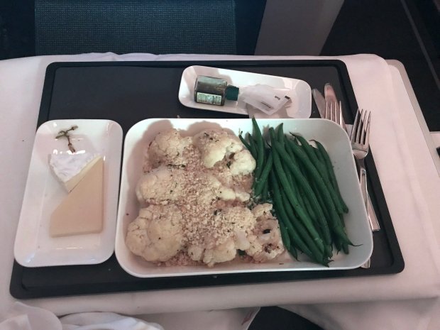 Speaking of first class, Swiss forgot to provision my vegan meal on this flight, but they had an extra vegetarian meal in first class, so they let me have that. It was some kind of breaded baked cauliflower thing, and OH MY GOD was it good. Not quite to the level of the amazing coconut curry I had on British Airways, but right up there, and better than the food I had in Emirates first class on the tail end of this trip. It’s not representative of Swiss’s business class catering in general, but it was a nice surprise when I thought I was going to have to pick around a big piece of meat for dinner.