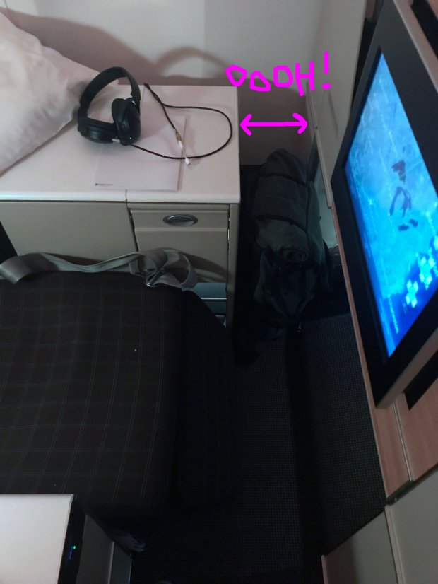 To give you an idea of the extra room afforded by the bulkhead seat, I present to you the following two examples. First, the seat is actually around 10” further away from the front console, which really makes a difference in terms of personal space. It also makes for a great storage nook for a backpack. In all the other throne seats, the front of the armrest touches the console, so you’d have to keep your bag in the overhead bin instead.