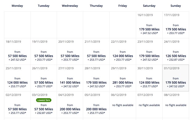 Check out the award calendars for November/December 2019 showing flights between SFO and either CDG or CPH. Weirdly, the prices aren’t uniformly different; on a couple days the CPH connection knocks 15,000 miles off the price of SFO-CDG direct, and on other days, it adds 14,500 miles. Hooray for dynamic pricing!