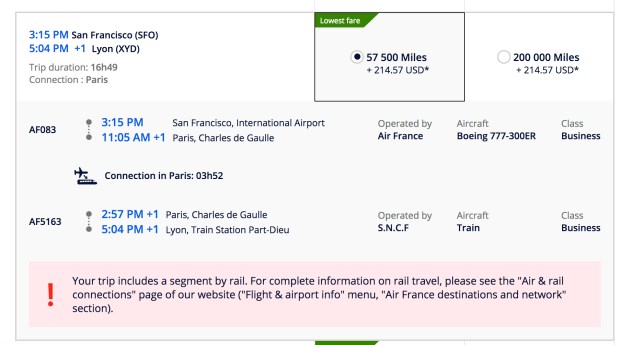 First, notice how adding the Lyon connection opens up additional saver awards that weren’t showing in the original search for SFO-CDG. Weird, and a useful reminder to try plugging in a bunch of different cities to see how they affect basic transatlantic award pricing. However, the reason I’m specifically pointing out Lyon is that Air France will give you the option both of flying to LYS airport as well as to XYD, otherwise known as Lyon Part-Dieu train station. In fact, on the day that I searched, the only options available for 57,500 miles involved a connection by train.